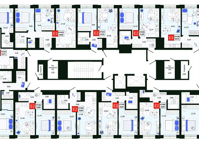 Разнообразие планировок: От уютных студий (25 м²) до просторных 3-комнатных квартир (107 м²) с мастер-спальнями и окнами в ванных.