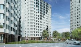 Ощутите динамику и энергию города благодаря стилевому решению фасадов с четкой геометрией, сочетающимися плавными линиями и гармоничной палитрой двух домов. Арочная форма окон добавляет шарма визуальному образу и ярко выделяет комплекс, задавая тренды развития всего района.