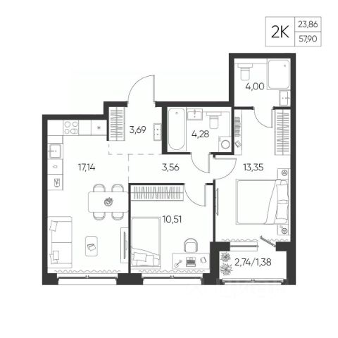 Санузел: Пол и стены — керамогранит, натяжной потолок, влагозащитные розетки, установлены унитаз, раковина со смесителем, акриловая ванна (или душевой поддон в студиях) и смеситель с душевой лейкой, предусмотрено размещение полотенцесушителя. Есть розетка и выводы для стиральной машины - холодная вода и слив.