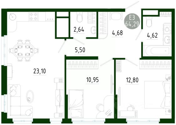 Здесь созданы все условия для комфортного проживания семьи: просторные комнаты свободно размещают мебель и создают атмосферу уюта; большой санузел обеспечивает дополнительное удобство при использовании пространства.