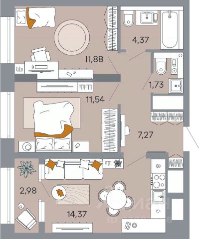 Продаётся 2-комнатная квартира в строящемся доме (Корпус 1), срок сдачи: I-кв. 2029, общей площадью 54.49 кв.м., на 14 этаже.