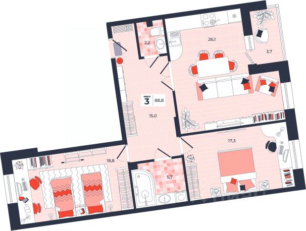 Продаётся 3-комнатная квартира в строящемся доме (Дом 30), срок сдачи: IV-кв. 2026, общей площадью 88.8 кв.м., на 2 этаже. Расположение, транспортная доступность Новый жилой комплекс "Юго-Восточный" строится в Туле, в 3,5 км от центра города. Благодаря удачным транспортным развязкам, автолюбители смогут доехать до центральных кварталов примерно за 5 10 минут, составив наиболее быстрый и удобный маршрут с учетом загруженности дорог. Проблем с мобильностью не возникнет и у пассажиров общественного транспорта. Рядом с домом расположены остановки автобусов и маршрутных такси, которые быстро довезут до любого района города. Так, чтобы добраться до центра, следует дойти пешком до остановки "Медтехника", где останавливается маршрутное такси, доезжающее до центральных кварталов всего за 7 8 минут. Инфраструктура Район, где возводится новый жилой комплекс, активно застраивается, и сеть инфраструктуры сов временем будет расширяться. Но и сейчас все, что нужно для комфортной жизни в городе, находится недалеко от жилого комплекса. В шаговой доступности расположены продуктовые магазины: "Виктория", "Овощи-фрукты", Магазин рыбы и мяса птицы, магазин мяса и колбас "У Максима", супермаркеты "Дикси", "Пятерочка", "SPAR". Неподалеку находится гипермаркет "Линия", крупный торговый центр, в котором расположены отделения банков, гипермаркет "Глобус", салон оптики, мебельный магазин "Столплит", зоомагазин "Четыре лапы" и пр. В соседнем здании находится строительный гипермаркет "Леруа Мерлен", за ним крупный магазин товаров для спорта, туризма и активного отдыха "Декатлон".Недалеко от жилого комплекса открыты кафе и рестораны: кофейня "Bonape", пиццерия "Культура", кафе "Вкуснов", кафе быстрого обслуживания "Rapido", ресторан "У фонтана" и пр.В районе есть аптеки, поликлиники, диагностические центры. В шаговой доступности от жилого комплекса расположено несколько детских садиков, в том числе, садик комбинированного вида "Алые паруса". Есть дошкольные отделения, входящие в состав образовательных центров, Центры развития ребенка. Поблизости расположены средние школы, в том числе, школа для детей с ОВЗ. Рядом с жилым комплексом находится Тульская Духовная Семинария и Суворовское училище. Надежность застройщик: достраивает объект ООО Ин-Групп.АрхитектураЖилой комплекс будет представлен 19 монолитно-кирпичными корпусами переменной этажности, выполненными в едином архитектурном стиле. При строительстве ЖК "Юго-Восточный" применяются современные материалы высокого качества, которые обеспечивают надежность домов и комфортный микроклимат в помещениях. Каждая секция оснащается современными лифтами. Помещения общего пользования отделываются экологичными материалами. Квартиры предлагаются однокомнатные (от 43,9 кв. м), двухкомнатные (от 45,8 кв. м), трехкомнатные (от 60,4 кв. м) и четырехкомнатные (от 87,2 кв. м), а также уютные студии (от 28,9 кв. м).На внутренней территории проводится комплексное благоустройство: озеленение, организация игровых площадок, мест для отдыха и зан
