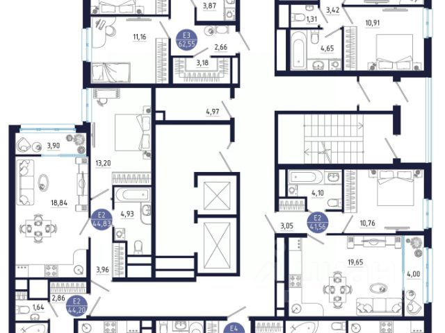 Как видно на плане есть мастер-комната с индивидуальной ванной комнатой, т.е. можно сделать в квартире 2 ванные и еще 3й туалет. Или вместо 3его туалета сделать кладовку. Причем очень важно отметить, что квартиры, которые располагаются выше, у них чем выше, тем больше вентиляционные шахты, и площадь этих помещений уменьшается, поэтому в этой квартире самые большие по данному стояку ванные и туалет.