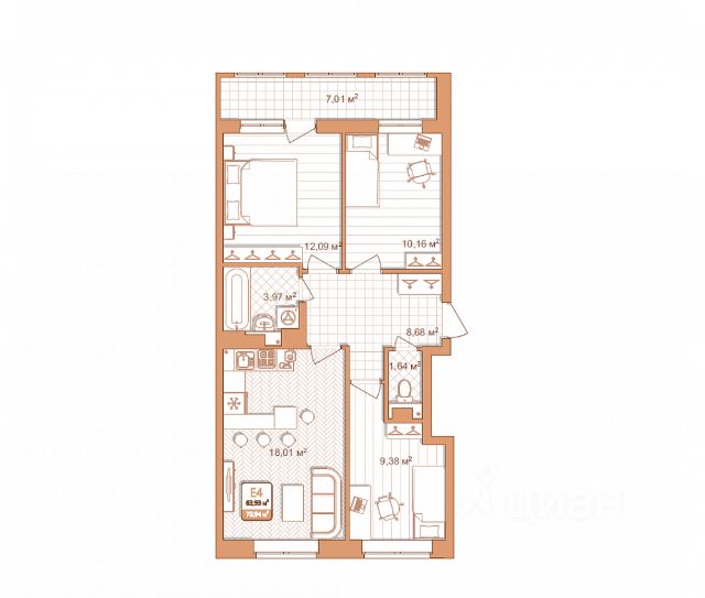 Удобная планировка: просторная кухня-гостиная, 2 изолированные комнаты, раздельный санузел, функциональный коридор