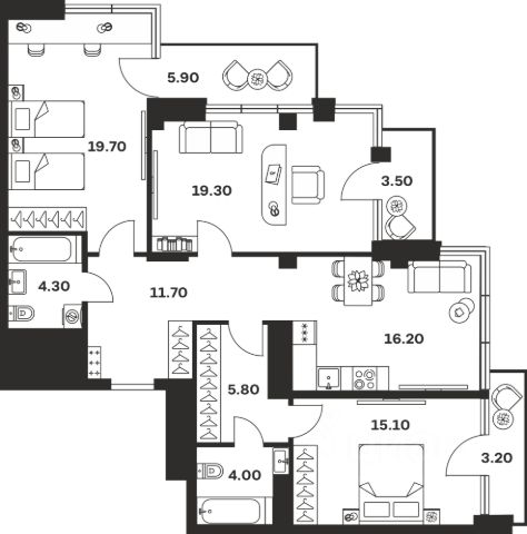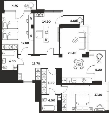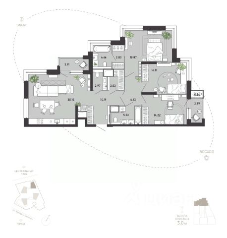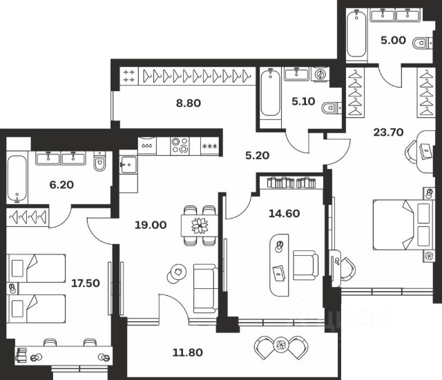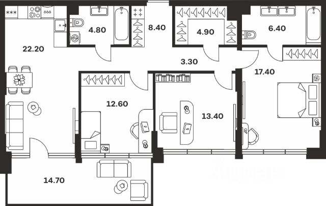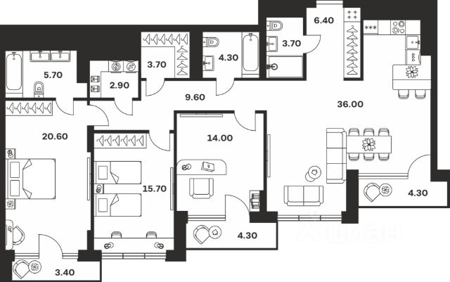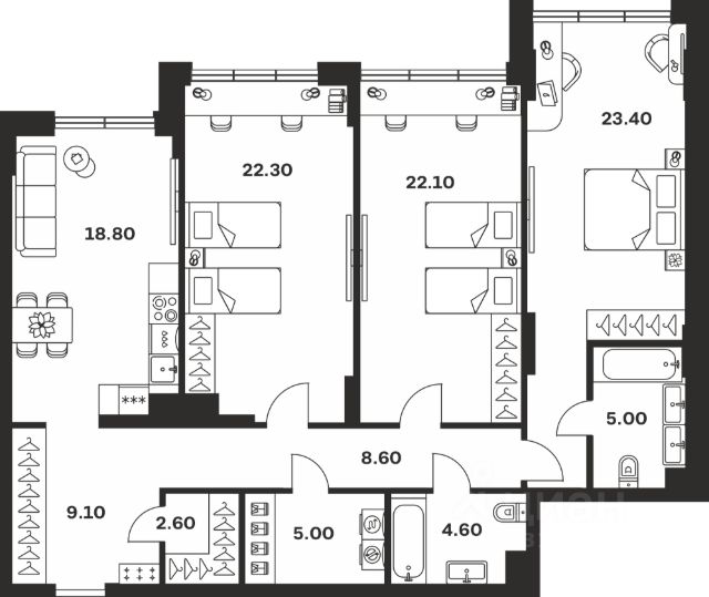 Планировка квартиры продумана до мелочей, обеспечивая каждому члену семьи возможность наслаждаться личным пространством.