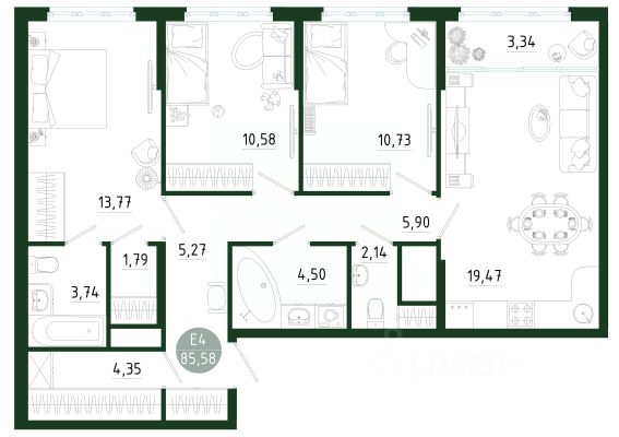 Продаётся 3-комнатная квартира в строящемся доме (Позиция 1), срок сдачи: III-кв. 2029, общей площадью 85.59 кв.м., на 2 этаже. Новый жилой комплекс в г. Тула "Платон Парк" от застройщика ООО "СЗ "МОНОЛИТ""