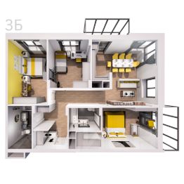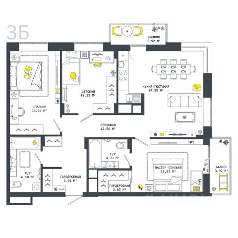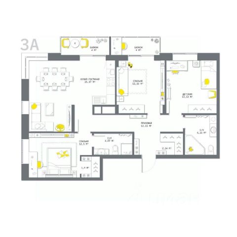 Идеальный вариант для семьи: три спальни, кухня-гостиная 26 м² с огромным эркерным окном, два санузла, гардеробная, постирочная и утеплённый балкон.