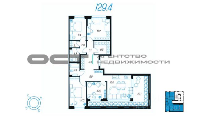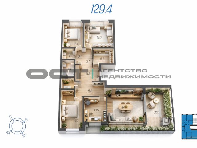 Представляем по-настоящему уникальное предложение — просторную квартиру-пентхаус площадью 129,4 м² с собственной террасой на крыше в жилом комплексе бизнес-класса "Михеева Парк".