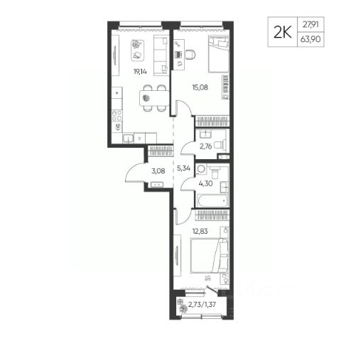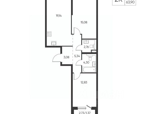 Санузел: Пол и стены — керамогранит, натяжной потолок, влагозащитные розетки, установлены унитаз, раковина со смесителем, акриловая ванна (или душевой поддон в студиях) и смеситель с душевой лейкой, предусмотрено размещение полотенцесушителя. Есть розетка и выводы для стиральной машины - холодная вода и слив.