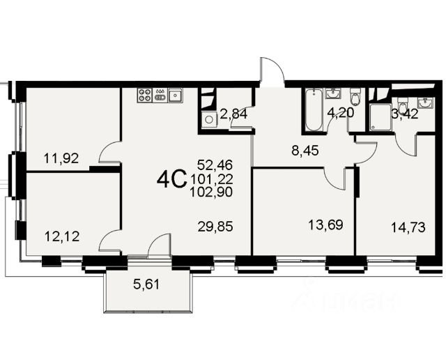 Продаётся 4-комнатная квартира в строящемся доме (Дом 30), срок сдачи: IV-кв. 2026, общей площадью 100.7 кв.м., на 2 этаже. Расположение, транспортная доступность Новый жилой комплекс "Юго-Восточный" строится в Туле, в 3,5 км от центра города. Благодаря удачным транспортным развязкам, автолюбители смогут доехать до центральных кварталов примерно за 5 10 минут, составив наиболее быстрый и удобный маршрут с учетом загруженности дорог. Проблем с мобильностью не возникнет и у пассажиров общественного транспорта. Рядом с домом расположены остановки автобусов и маршрутных такси, которые быстро довезут до любого района города. Так, чтобы добраться до центра, следует дойти пешком до остановки "Медтехника", где останавливается маршрутное такси, доезжающее до центральных кварталов всего за 7 8 минут. Инфраструктура Район, где возводится новый жилой комплекс, активно застраивается, и сеть инфраструктуры сов временем будет расширяться. Но и сейчас все, что нужно для комфортной жизни в городе, находится недалеко от жилого комплекса. В шаговой доступности расположены продуктовые магазины: "Виктория", "Овощи-фрукты", Магазин рыбы и мяса птицы, магазин мяса и колбас "У Максима", супермаркеты "Дикси", "Пятерочка", "SPAR". Неподалеку находится гипермаркет "Линия", крупный торговый центр, в котором расположены отделения банков, гипермаркет "Глобус", салон оптики, мебельный магазин "Столплит", зоомагазин "Четыре лапы" и пр. В соседнем здании находится строительный гипермаркет "Леруа Мерлен", за ним крупный магазин товаров для спорта, туризма и активного отдыха "Декатлон".Недалеко от жилого комплекса открыты кафе и рестораны: кофейня "Bonape", пиццерия "Культура", кафе "Вкуснов", кафе быстрого обслуживания "Rapido", ресторан "У фонтана" и пр.В районе есть аптеки, поликлиники, диагностические центры. В шаговой доступности от жилого комплекса расположено несколько детских садиков, в том числе, садик комбинированного вида "Алые паруса". Есть дошкольные отделения, входящие в состав образовательных центров, Центры развития ребенка. Поблизости расположены средние школы, в том числе, школа для детей с ОВЗ. Рядом с жилым комплексом находится Тульская Духовная Семинария и Суворовское училище. Надежность застройщик: достраивает объект ООО Ин-Групп.АрхитектураЖилой комплекс будет представлен 19 монолитно-кирпичными корпусами переменной этажности, выполненными в едином архитектурном стиле. При строительстве ЖК "Юго-Восточный" применяются современные материалы высокого качества, которые обеспечивают надежность домов и комфортный микроклимат в помещениях. Каждая секция оснащается современными лифтами. Помещения общего пользования отделываются экологичными материалами. Квартиры предлагаются однокомнатные (от 43,9 кв. м), двухкомнатные (от 45,8 кв. м), трехкомнатные (от 60,4 кв. м) и четырехкомнатные (от 87,2 кв. м), а также уютные студии (от 28,9 кв. м).На внутренней территории проводится комплексное благоустройство: озеленение, организация игровых площадок, мест для отдыха и за
