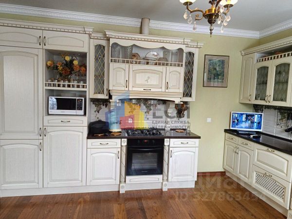 На первом этаже кухня и гостиная объединены в целостное пространство. Много места для приема гостей, проведения семейных праздников. Кухня очень красивая, в общей стилистике дома. Фасады ясень. В гостиной авторская картина во всю стену, украшает и расширяет пространство, делает помещение неповторимым и уникальным. В эркере организована обеденная зона.