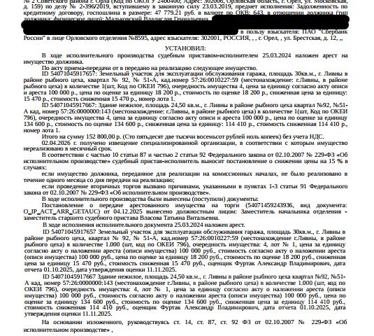Данные получены с сайта ГИС Торги. Здание, назначение: нежилое, наименование: гараж, кадастровый номер 57:26:0000000:143, площадь 24,5 кв.м., местоположение: Орловская обл, г Ливны, гараж 51-А в квартале 92 в районе рыбного цеха. • Земельный участок, категория земель: земли населенных пунктов, виды разрешенного использования: для эксплуатации и обслуживания гаража, кадастровый номер 57:26:0010227:59, площадь 30 кв.м., местоположение установлено относительно ориентира, расположенного в границах участка. Почтовый адрес ориентира: Орловская обл, г Ливны, в районе рыбного цеха квартал 92, 51-А. Особые отметки: Граница земельного участка не установлена в соответствии с требованиями земельного законодательства. СМ. ИЗВЕЩЕНИЕ. Взыскатель: ПАО "Сбербанк России". Начальная цена: 129 880 (Сто двадцать девять тысяч восемьсот восемьдесят) руб. 00 коп., без НДС, сумма задатка: 60 000 (Шестьдесят тысяч) руб. 00 коп. Шаг аукциона 1%: 1 298 (Одна тысяча двести девяносто восемь) руб. 80 коп.