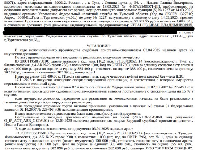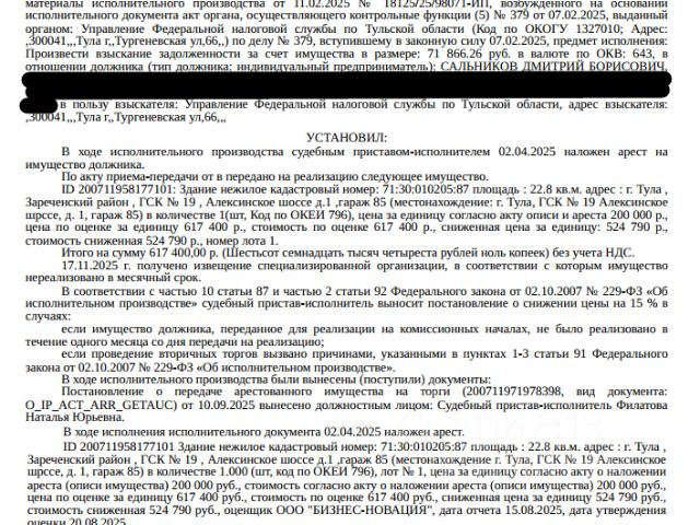 Данные получены с сайта ГИС Торги. Здание, назначение: нежилое, наименование: гараж, кадастровый номер 71:30:010205:87, площадь 22,8 кв.м., местоположение: Тульская область, г.Тула, Зареченский район, ГСК 19, Алексинское шоссе д.1, гараж 85. Здание расположено в пределах земельного участка с кадастровым номером 71:30:010204:6, сведениями о правообладателе земельного участка Организатор торгов не располагает. Согласно ответу Комитета имущественных и земельных отношений Администрации г. Тулы от 24.04.2025 Сальников Д.Б. с заявлением о предварительном согласовании предоставления земельного участка не обращался. Взыскатель: УФНС по Тульской области. Начальная цена: 524 790 (Пятьсот двадцать четыре тысячи семьсот девяносто) руб. 00 коп., без НДС. Задаток: 250 000 (Двести пятьдесят тысяч) руб. 00 коп.; Шаг аукциона 1%: 5 247 (Пять тысяч двести сорок семь) руб. 90 коп. Купить гараж на шоссе Алексинское в городе Тула.