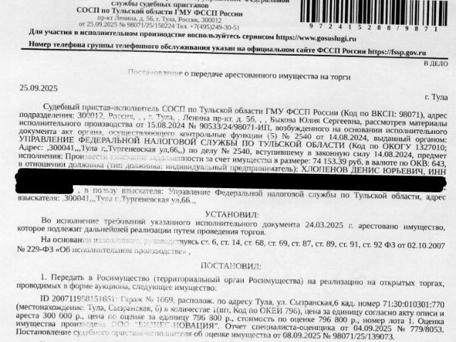 Данные получены с сайта ГИС Торги. Здание, назначение: нежилое, наименование: гараж с подвалом, кадастровый номер 71:30:010301:770, площадь 21,4 кв.м., местоположение: Тульская область, г.Тула, Зареченский р-н, ул.Сызранская, д.6, АК 30, гараж 1069. Здание расположено в пределах земельного участка с кадастровым номером 71:30:010301:92, сведениями о правообладателе земельного участка Организатор торгов не располагает. Взыскатель: УФНС по Тульской области. Начальная цена: 796 800 (Семьсот девяносто шесть тысяч восемьсот) руб. 00 коп., без НДС. Задаток: 390 000 (Триста девяносто тысяч) руб. 00 коп.; Шаг аукциона 1%: 7 968 (Семь тысяч девятьсот шестьдесят восемь) руб. 00 коп. Купить гараж в округе Пролетарский в городе Тула.