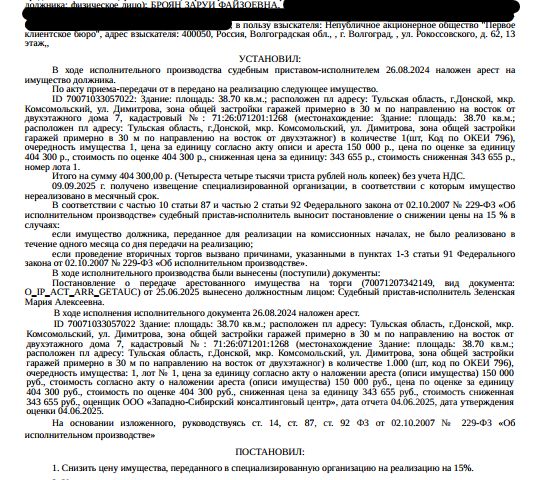 Данные получены с сайта ГИС Торги. Здание, нежилое, индивидуальный гараж, площадь: 38,7 кв.м, кад.номер: 71:26:071201:1268, Тульская обл, г. Донской, мкр. Комсомольский, ул. Димитрова, зона общей застройки гаражей примерно в 30 м по направлению на восток от двухэтажного жилого дома 7. • Земельный участок, земли населенных пунктов; для размещения индивидуального гаража; площадь: 39+/-2.2 кв.м., кад.номер: 71:26:070906:199; местоположение относительно ориентира, расположенного за пределами участка. Ориентир двухэтажный жилой дом. Участок находится примерно в 30 м по направлению на восток от ориентира. Почтовый адрес ориентира: Тульская обл, г. Донской, мкр. Комсомольский, ул. Димитрова, д. 7. Взыскатель: НАО "Первое клиентское бюро". Начальная цена: 374 255 (Триста семьдесят четыре тысячи двести пятьдесят пять) руб. 00 коп., без НДС. Задаток: 180 000 (Сто восемьдесят тысяч) руб. 00 коп.; Шаг аукциона 1%: 3 742 (Три тысячи семьсот сорок два) руб. 55 коп. Купить гараж в Тульской области.