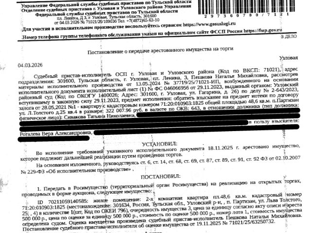 Данные получены с сайта ГИС Торги. Помещение, назначение: жилое, наименование: квартира, площадь 48,6 кв.м., кадастровый номер 71:20:010903:1825, местоположение: Тульская область, р-н Узловский, п Партизан, ул Льва Толстого, д 25, кв 4. Согласно выписке ЕГРН от 10.04.2026 г. принято заявление о невозможности государственной регистрации перехода, прекращения, ограничения права и обременения на объект недвижимости без личного участия правообладателя или его законного представителя. Сведениями о зарегистрированных по данному адресу лицах, а также о задолженности по взносам на капитальный ремонт Организатор торгов не располагает. Залогодержатель: Рогалева В.А. Начальная цена: 500 000 (Пятьсот тысяч) руб. 00 коп., без НДС. Задаток: 20 000 (Двадцать тысяч) руб. 00 коп. Шаг аукциона 1%: 5 000 (Пять тысяч) руб. 00 коп.