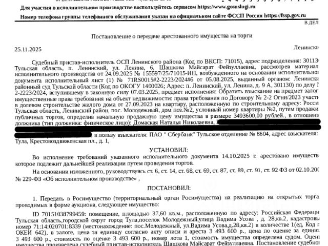 Данные получены с сайта ГИС Торги. Помещение, назначение: жилое, наименование: квартира, кадастровый номер 71:14:020701:8339, площадь 37,6 кв.м., местоположение: Российская Федерация, Тульская область, городской округ город Тула, поселок Молодежный, улица Вадима Усова, дом 28, квартира 2. Сведениями о зарегистрированных по данному адресу лицах, а также о задолженности по взносам на капитальный ремонт Организатор торгов не располагает. Залогодержатель: ПАО "Сбербанк России". Начальная цена: 3 493 600 (Три миллиона четыреста девяносто три тысячи шестьсот) руб. 00 коп., без НДС. Задаток: 170 000 (Сто семьдесят тысяч) руб. 00 коп. Шаг аукциона 1%: 34 936 (Тридцать четыре тысячи девятьсот тридцать шесть) руб. 00 коп.