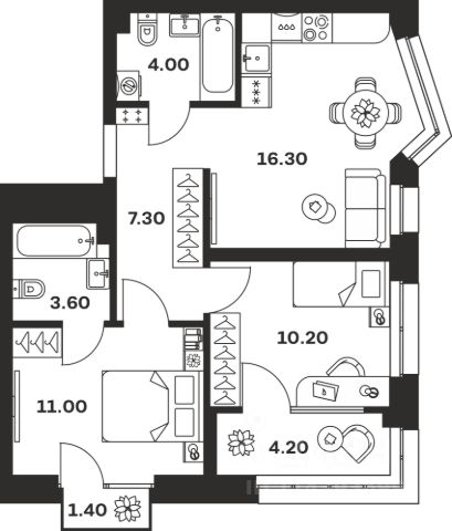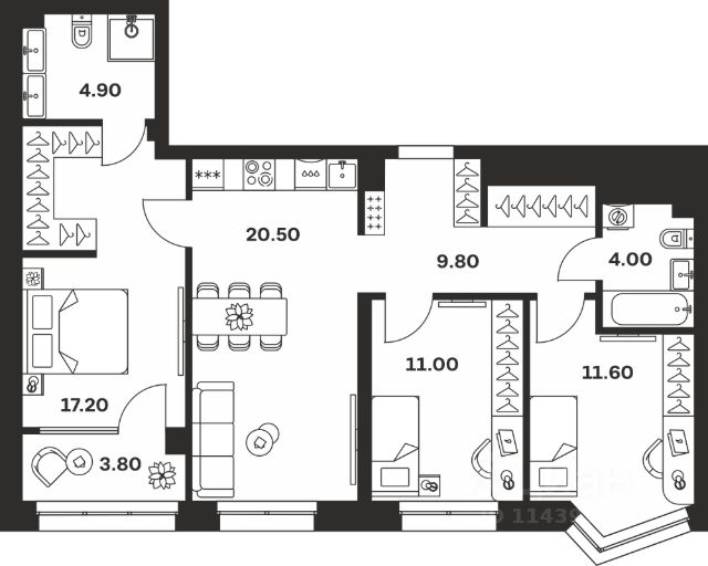 Идеальный вариант для семьи: три спальни, кухня-гостиная 26 м² с огромным эркерным окном, два санузла, гардеробная, постирочная и утеплённый балкон.