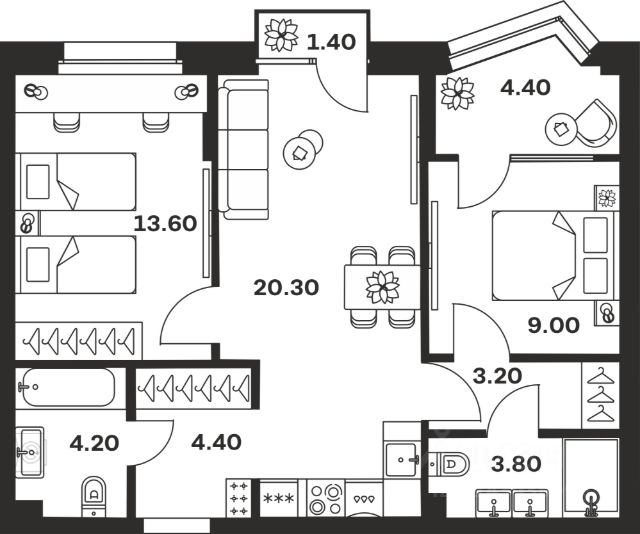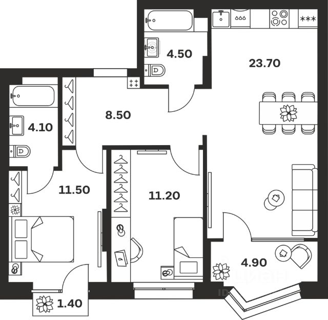 Идеальный вариант для семьи: три спальни, кухня-гостиная 26 м² с огромным эркерным окном, два санузла, гардеробная, постирочная и утеплённый балкон.