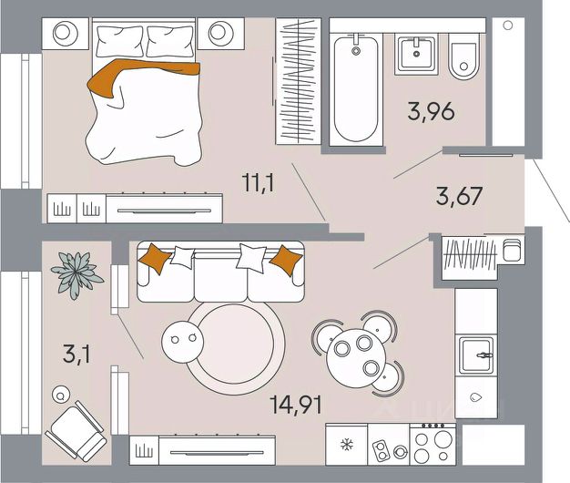 Продаётся 1-комнатная квартира в строящемся доме (Корпус 1), срок сдачи: I-кв. 2029, общей площадью 36.74 кв.м., на 4 этаже.