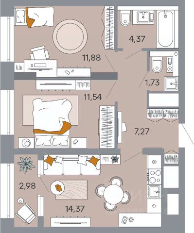 Продаётся 3-комнатная квартира в строящемся доме (Корпус 1), срок сдачи: I-кв. 2029, общей площадью 73.73 кв.м., на 4 этаже.