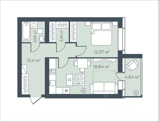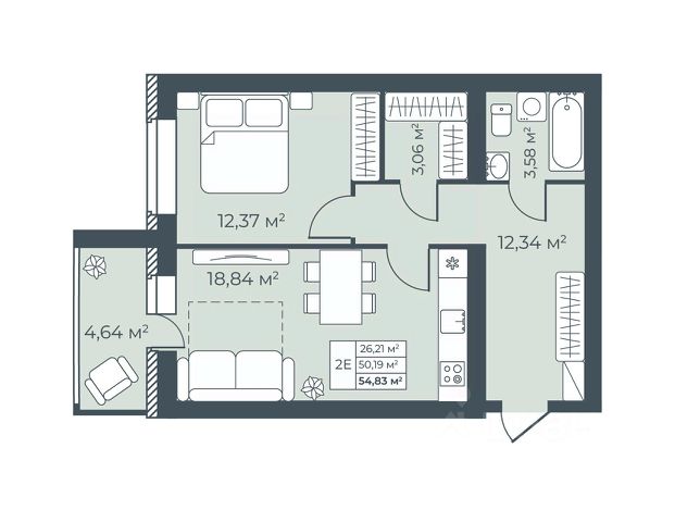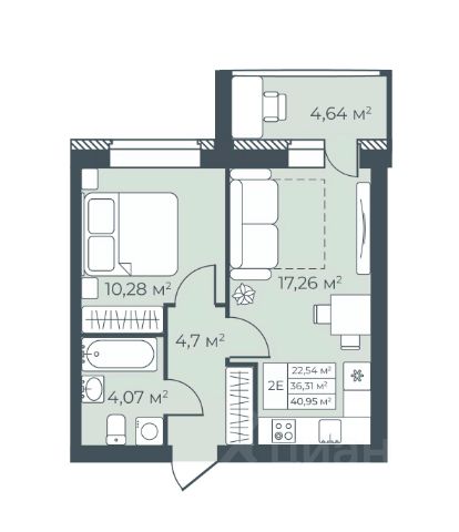 Санузел: Пол и стены — керамогранит, натяжной потолок, влагозащитные розетки, установлены унитаз, раковина со смесителем, акриловая ванна (или душевой поддон в студиях) и смеситель с душевой лейкой, предусмотрено размещение полотенцесушителя. Есть розетка и выводы для стиральной машины - холодная вода и слив.