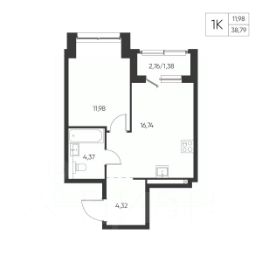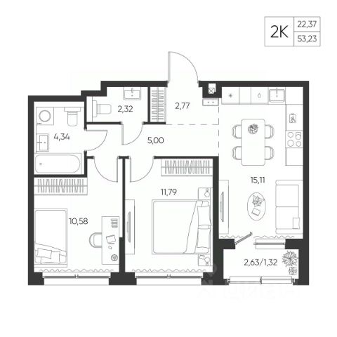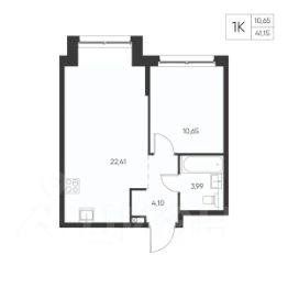 Общая площадь — 48.81 кв. м, из которых 22,7 м2, составляет жилая площадь, а просторная кухня занимает 15,96 м2.