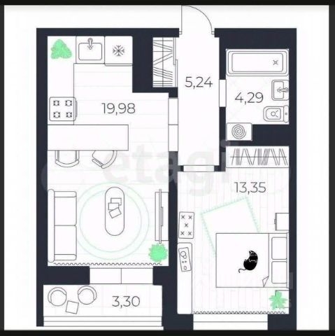 Общая площадь — 48.81 кв. м, из которых 22,7 м2, составляет жилая площадь, а просторная кухня занимает 15,96 м2.