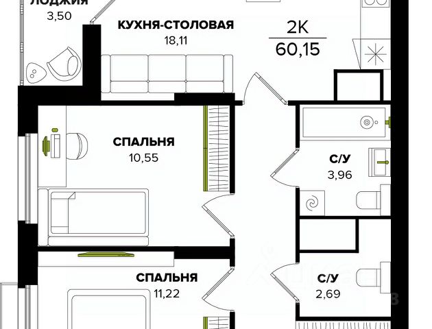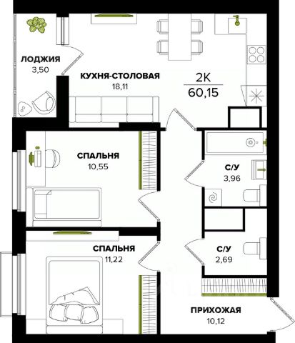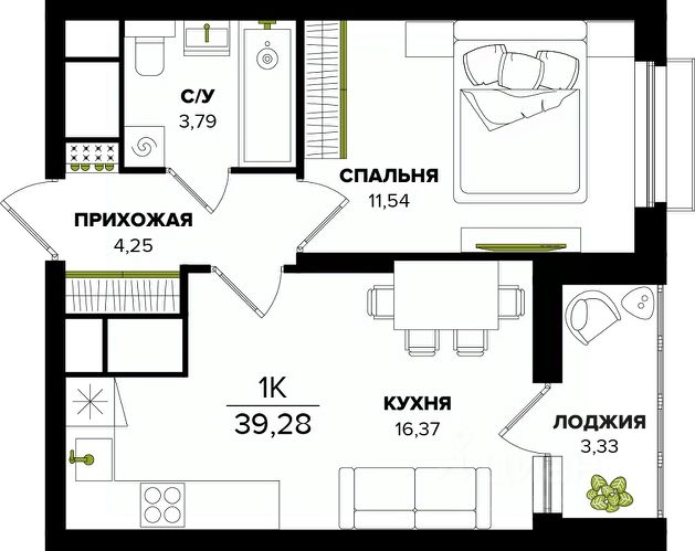 На первом этаже вас встретит функциональная прихожая, светлая и просторная кухня, современный санузел, уютная лоджия и большая гостиная, которую можно легко зонировать под ваши нужды — будь то игровая зона для детей или место для семейных встреч.