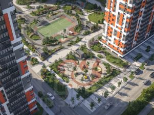 окружён зеленью и прогулочными зонами, изолирован от шума магистралей