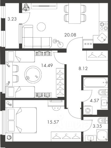 Планировка евротрешки. Кухня обьединена с