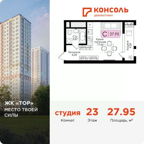 Продается квартира-студия 213 с предчистовой отделкой в ЖК "ТОР" площадью 27.95 на 23 этаже от застройщика Консоль девелопмент. Жилому комплексу ТОР присвоен повышенный уровень комфортности — комфорт плюс. Он подразумевает светлые просторные квартиры с большими окнами и удобной планировкой, оригинальные парадные и общественные пространства.