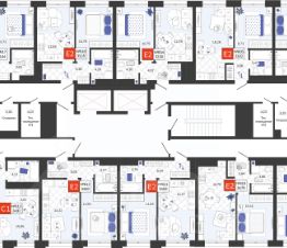 Яркая современная архитектура с выступающими эркерами, которые добавляют уникальности как экстерьеру, так и внутреннему дизайну квартир. Корзины для кондиционеров повторяющие контрастные цвета фасада.