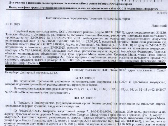 Данные получены с сайта ГИС Торги. Помещение, назначение: жилое, наименование: квартира, кадастровый номер 71:14:040401:9006, площадь 39,9 кв.м., адрес: Российская Федерация, Тульская область, муниципальное образование город Тула, деревня Мыза, мкр. Северная Мыза, улица Героя России Горшкова, дом 11, корпус 1, квартира 22. Согласно справке ООО "УК Северная Мыза" от 14.10.2025 по данному адресу зарегистрировано 2 человека. Сведениями о задолженности по взносам на капитальный ремонт Организатор торгов не располагает. Залогодержатель: Банк ВТБ (ПАО). Начальная цена: 3 176 000 (Три миллиона сто семьдесят шесть тысяч) руб. 00 коп., без НДС. Задаток: 150 000 (Сто пятьдесят тысяч) руб. 00 коп. Шаг аукциона 1%: 31 760 (Тридцать одна тысяча семьсот шестьдесят) руб. 00 коп.