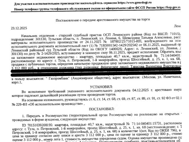 Данные получены с сайта ГИС Торги. Помещение, назначение: жилое, наименование: квартира, кадастровый номер 71:14:020701:8339, площадь 37,6 кв.м., местоположение: Российская Федерация, Тульская область, городской округ город Тула, поселок Молодежный, улица Вадима Усова, дом 28, квартира 2. Сведениями о зарегистрированных по данному адресу лицах, а также о задолженности по взносам на капитальный ремонт Организатор торгов не располагает. Залогодержатель: ПАО "Сбербанк России". Начальная цена: 3 493 600 (Три миллиона четыреста девяносто три тысячи шестьсот) руб. 00 коп., без НДС. Задаток: 170 000 (Сто семьдесят тысяч) руб. 00 коп. Шаг аукциона 1%: 34 936 (Тридцать четыре тысячи девятьсот тридцать шесть) руб. 00 коп. Продам квартиру со свободной планировкой в Тульской области.