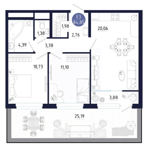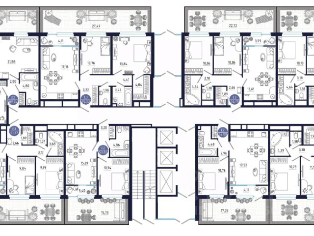 Как видно на плане есть мастер-комната с индивидуальной ванной комнатой, т.е. можно сделать в квартире 2 ванные и еще 3й туалет. Или вместо 3его туалета сделать кладовку. Причем очень важно отметить, что квартиры, которые располагаются выше, у них чем выше, тем больше вентиляционные шахты, и площадь этих помещений уменьшается, поэтому в этой квартире самые большие по данному стояку ванные и туалет.