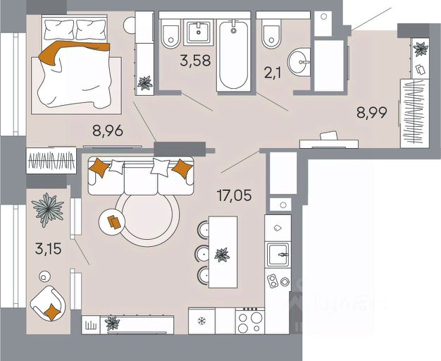 Продаётся 2-комнатная квартира в строящемся доме (Корпус 1), срок сдачи: I-кв. 2029, общей площадью 56.14 кв.м., на 9 этаже.