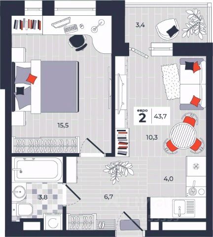 Продаётся 2-комнатная квартира в строящемся доме (Дом 30), срок сдачи: IV-кв. 2026, общей площадью 43.7 кв.м., на 3 этаже. Расположение, транспортная доступность Новый жилой комплекс "Юго-Восточный" строится в Туле, в 3,5 км от центра города. Благодаря удачным транспортным развязкам, автолюбители смогут доехать до центральных кварталов примерно за 5 10 минут, составив наиболее быстрый и удобный маршрут с учетом загруженности дорог. Проблем с мобильностью не возникнет и у пассажиров общественного транспорта. Рядом с домом расположены остановки автобусов и маршрутных такси, которые быстро довезут до любого района города. Так, чтобы добраться до центра, следует дойти пешком до остановки "Медтехника", где останавливается маршрутное такси, доезжающее до центральных кварталов всего за 7 8 минут. Инфраструктура Район, где возводится новый жилой комплекс, активно застраивается, и сеть инфраструктуры сов временем будет расширяться. Но и сейчас все, что нужно для комфортной жизни в городе, находится недалеко от жилого комплекса. В шаговой доступности расположены продуктовые магазины: "Виктория", "Овощи-фрукты", Магазин рыбы и мяса птицы, магазин мяса и колбас "У Максима", супермаркеты "Дикси", "Пятерочка", "SPAR". Неподалеку находится гипермаркет "Линия", крупный торговый центр, в котором расположены отделения банков, гипермаркет "Глобус", салон оптики, мебельный магазин "Столплит", зоомагазин "Четыре лапы" и пр. В соседнем здании находится строительный гипермаркет "Леруа Мерлен", за ним крупный магазин товаров для спорта, туризма и активного отдыха "Декатлон".Недалеко от жилого комплекса открыты кафе и рестораны: кофейня "Bonape", пиццерия "Культура", кафе "Вкуснов", кафе быстрого обслуживания "Rapido", ресторан "У фонтана" и пр.В районе есть аптеки, поликлиники, диагностические центры. В шаговой доступности от жилого комплекса расположено несколько детских садиков, в том числе, садик комбинированного вида "Алые паруса". Есть дошкольные отделения, входящие в состав образовательных центров, Центры развития ребенка. Поблизости расположены средние школы, в том числе, школа для детей с ОВЗ. Рядом с жилым комплексом находится Тульская Духовная Семинария и Суворовское училище. Надежность застройщик: достраивает объект ООО Ин-Групп.АрхитектураЖилой комплекс будет представлен 19 монолитно-кирпичными корпусами переменной этажности, выполненными в едином архитектурном стиле. При строительстве ЖК "Юго-Восточный" применяются современные материалы высокого качества, которые обеспечивают надежность домов и комфортный микроклимат в помещениях. Каждая секция оснащается современными лифтами. Помещения общего пользования отделываются экологичными материалами. Квартиры предлагаются однокомнатные (от 43,9 кв. м), двухкомнатные (от 45,8 кв. м), трехкомнатные (от 60,4 кв. м) и четырехкомнатные (от 87,2 кв. м), а также уютные студии (от 28,9 кв. м).На внутренней территории проводится комплексное благоустройство: озеленение, организация игровых площадок, мест для отдыха и зан