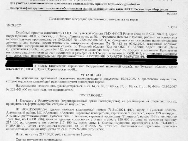 Здание, назначение: нежилое, наименование: гараж с подвалом, площадь 20,5 кв.м., кадастровый номер 71:24:030211:1074, местоположение: Тульская область, Алексинский район, МО г.Алексин, г.Алексин, Гаражные кооперативы, гараж.кооп."Прогресс", гараж 159. Согласно ответу Администрации МО г. Алексин от 23.04.2025 в связи с тем, что сведения о границах здания не внесены в ЕГРН, установить принадлежность земельного участка под зданием не предоставляется возможным. Взыскатель: УФНС по Тульской области. Начальная цена: 217 100 (Двести семнадцать тысяч сто) руб. 00 коп., без НДС. Задаток: 100 000 (Сто тысяч) руб. 00 коп.; Шаг аукциона 1%: 2 171 (Две тысячи сто семьдесят один) руб. 00 коп. Купить наземную парковку в Алексине.