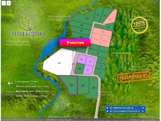 КП Дубрава Удач находится в Заокском районе Тульской области - экологически чистом месте. В 10 километрах от деревни нет ничего, что загрязняло бы окружающую среду, нет заводов и других промышленных объектов. Это спокойное и живописное место для отдыха.