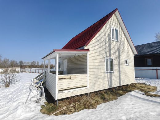 Построен по каркасной технологии на свайном фундаменте, снаружи обшит сайдингом внутри вагонка пропитанная лаком, оставлен естественный цвет дерева.