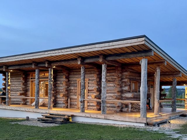 Сруб изготовлен на севере Карелии из кело, так называют сосны выросшие за полярным кругом, высохшие на корню и продолжающие стоять вертикально много лет. В этом диаметре бревна примерный возраст каждого 100+ лет. Штучная древесина реально с уникальными свойствами, её добывают только в северной части Карелии, но ценность не только в том, что это редкий материал, а скорее, что его ничем не нужно обрабатывать, никаких антисептиков и прочих обработок. Древесина плотная, снаружи серебристо серого цвета, а внутри янтарная.