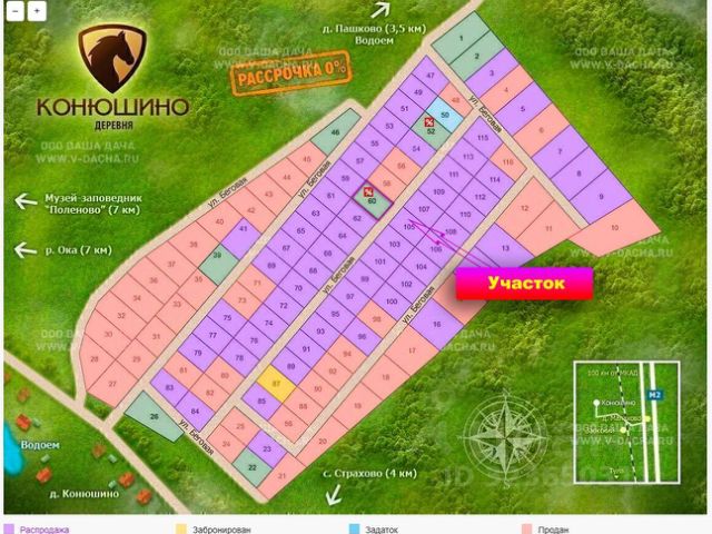 Продается участок 8 соток в деревне Конюшино. Участок правильной формы, ровный, сухой - подъезд осуществляется по укатанной щебневой дороге. Подведено электричество 15 кВт на 3 фазы - этой мощности хватит отопить целый дом. Деревня находится в 113 км от МКАД по Симферопольскому шоссе. До Конюшино хорошая щебневая дорога. Участки граничат с лесом. В 1,5 км протекает река Скнига, в 3,5 км проходит русло реки Ока. Земельный участок имеет статус ИЖС - можно прописаться и жить как на постоянной основе, так и сезонно. Документы оформлены и готовы к сделке. Место сочетает в себе великолепие природных ландшафтов, каскад прудов, а так же близость к необходимой инфраструктуре . Деревня Конюшино не входит в зону охраняемого природного ландшафта Музея В.Д. Поленова, следовательно не имеет ограничений по оформлению строений, в отличии от других поселков находящихся в этом красивейшем месте! Массив участков располагается в 113 км от МКАД по Симферопольскому шоссе в экологически чистом поселке Заокский. На общественном транспорте добраться можно на электричке Курское направление Москва - Тула станция "Романовские Дачи" или "Тарусская" далее на такси или автобусе.