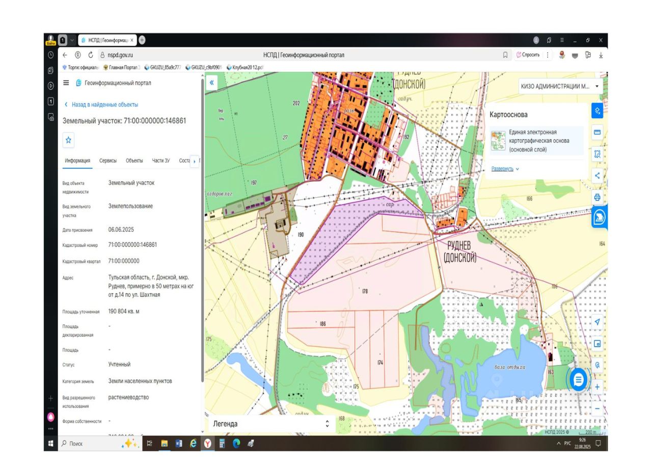кадастровый номер 71:00:000000:146861; местоположение: Тульская область, г. Донской, мкр. Руднев, примерно в 50 метрах на юг от д. 14 по ул. Шахтная; площадь 190804,0 кв.м; разрешенное использование: растениеводство