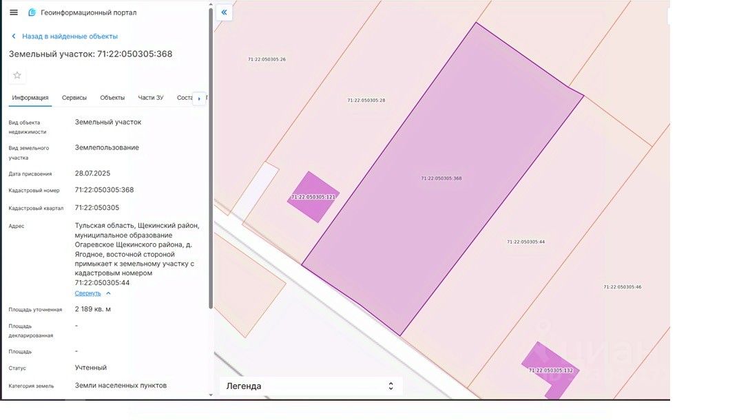 площадью 2189 кв.м, с кадастровым номером 71:22:050305:368, категория земель "Земли населенных пунктов", местоположение земельного участка: Тульская область, Щекинский район, муниципальное образование Огаревское Щекинского района, д. Ягодное, восточной стороной примыкает к земельному участку с кадастровым номером 71:22:050305:44, с разрешенным использованием для ведения личного подсобного хозяйства