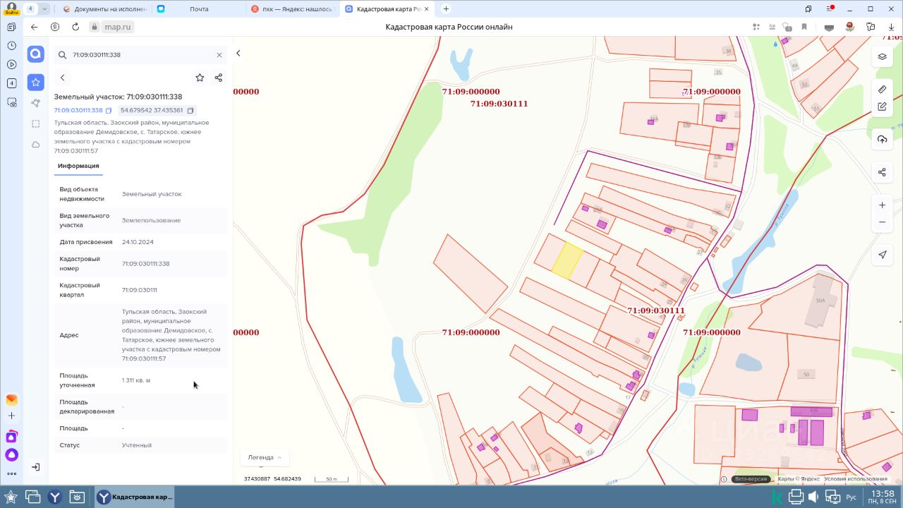 право заключения договора аренды земельного участка из земель населенных пунктов с кадастровым номером 71:09:030111:338, площадь 1311 кв. м, местоположение: Тульская область, Заокский район, муниципальное образование Демидовское, с. Татарское, южнее земельного участка с кадастровым номером 71:09:030111:57, вид разрешенного использования: для ведения личного подсобного хозяйства (приусадебный земельный участок).
