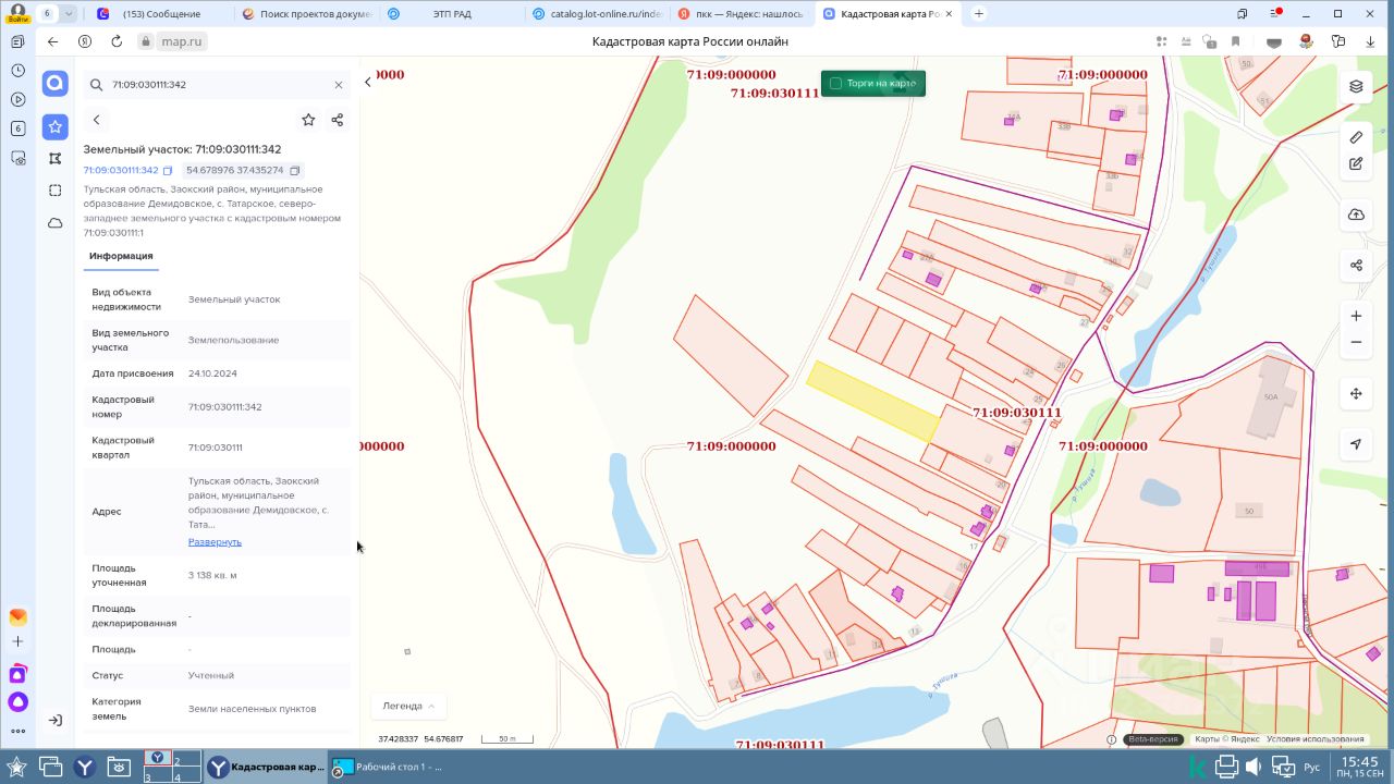 право заключения договора аренды земельного участка из земель населенных пунктов с кадастровым номером 71:09:030111:342, площадь 3138 кв. м, местоположение: Российская Федерация, Тульская область, Заокский район, муниципальное образование Демидовское, с. Татарское, северо — западнее земельного участка с кадастровым номером 71:09:030111:1, вид разрешенного использования: для ведения личного подсобного хозяйства (приусадебный земельный участок).