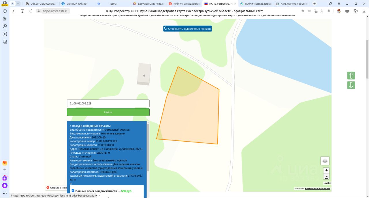 право заключения договора аренды земельного участка из земель населенных пунктов с кадастровым номером 71:09:011003:229 площадью 2830 кв. м, адрес: Тульская область, р-н Заокский, д. Алешково, 5Б уч., вид разрешенного использования: для ведения личного подсобного хозяйства.