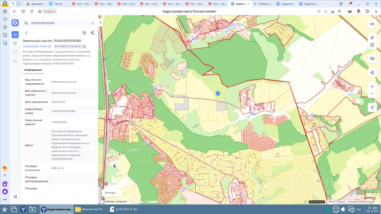 право заключения договора аренды земельного участка из земель населенных пунктов с кадастровым номером 71:09:020101:10280, площадь 988 кв. м, местоположение: Российская Федерация, Тульская область, Заокский район, муниципальное образование Малаховское, д. Федино, юго — западнее земельного участка с кадастровым номером 71:09:020103:170, вид разрешенного использования: для ведения личного подсобного хозяйства (приусадебный земельный участок).