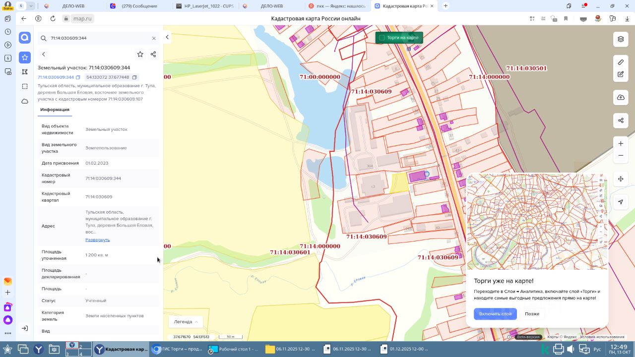право заключения договора аренды земельного участка из земель населенных пунктов с кадастровым номером 71:14:030609:344, площадью 1200 кв.м, местоположение: Тульская область, муниципальное образование г. Тула, деревня Большая Еловая, восточнее земельного участка с кадастровым номером 71:14:030609:107, вид разрешенного использования: складские площадки.